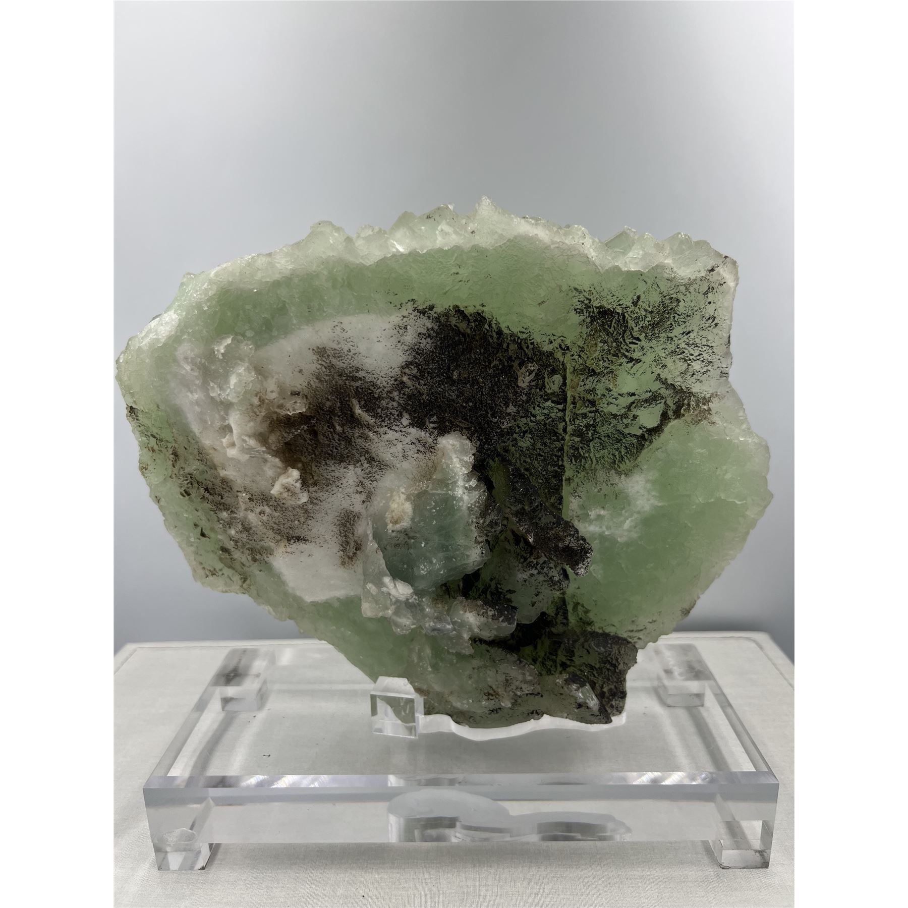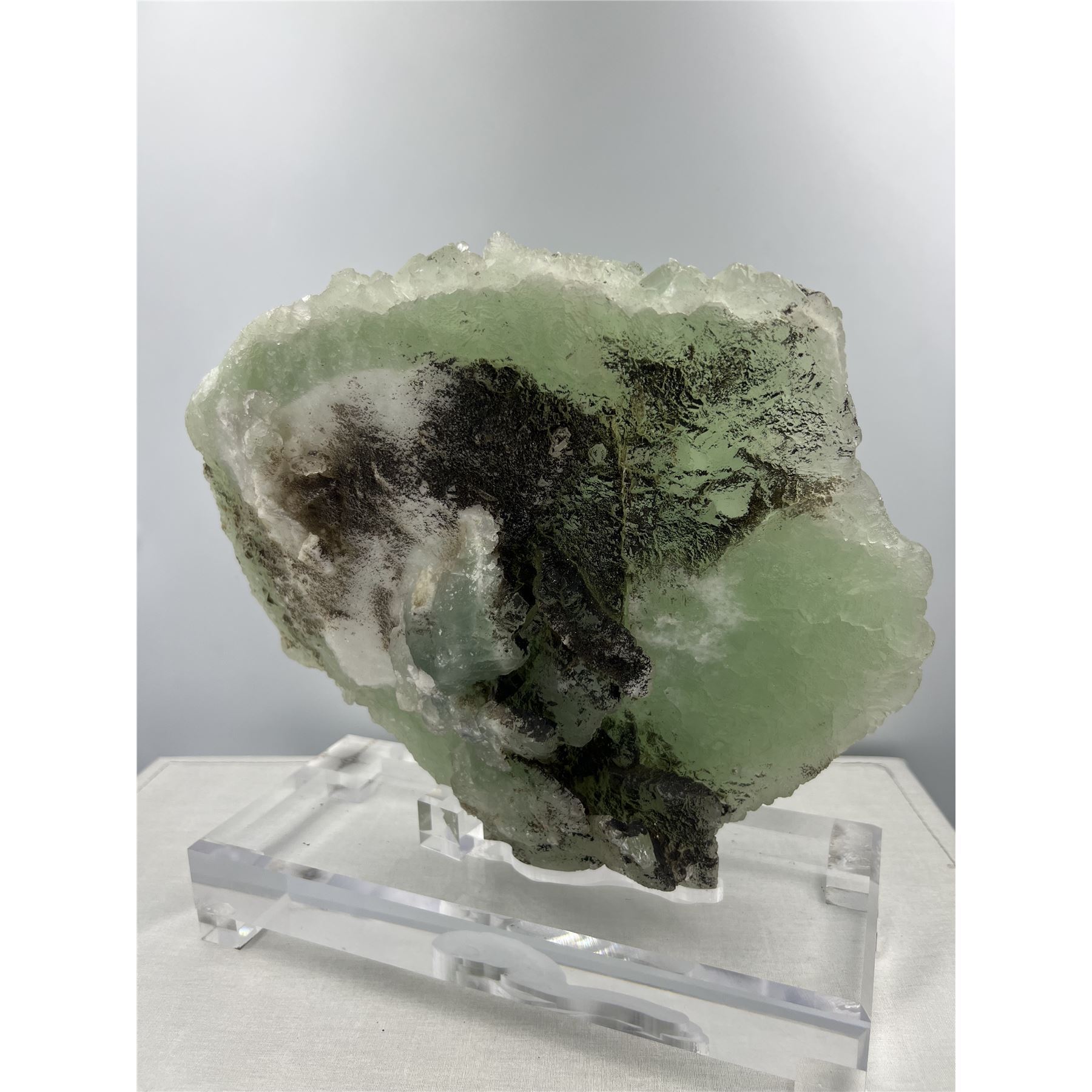 10.5 x 8.5 INCH LARGE GREEN FLUORITE SPECIMEN COLLECTOR PIECE . BACK SIDE INCULSION . ARCLYIC BASE INCLUDED .