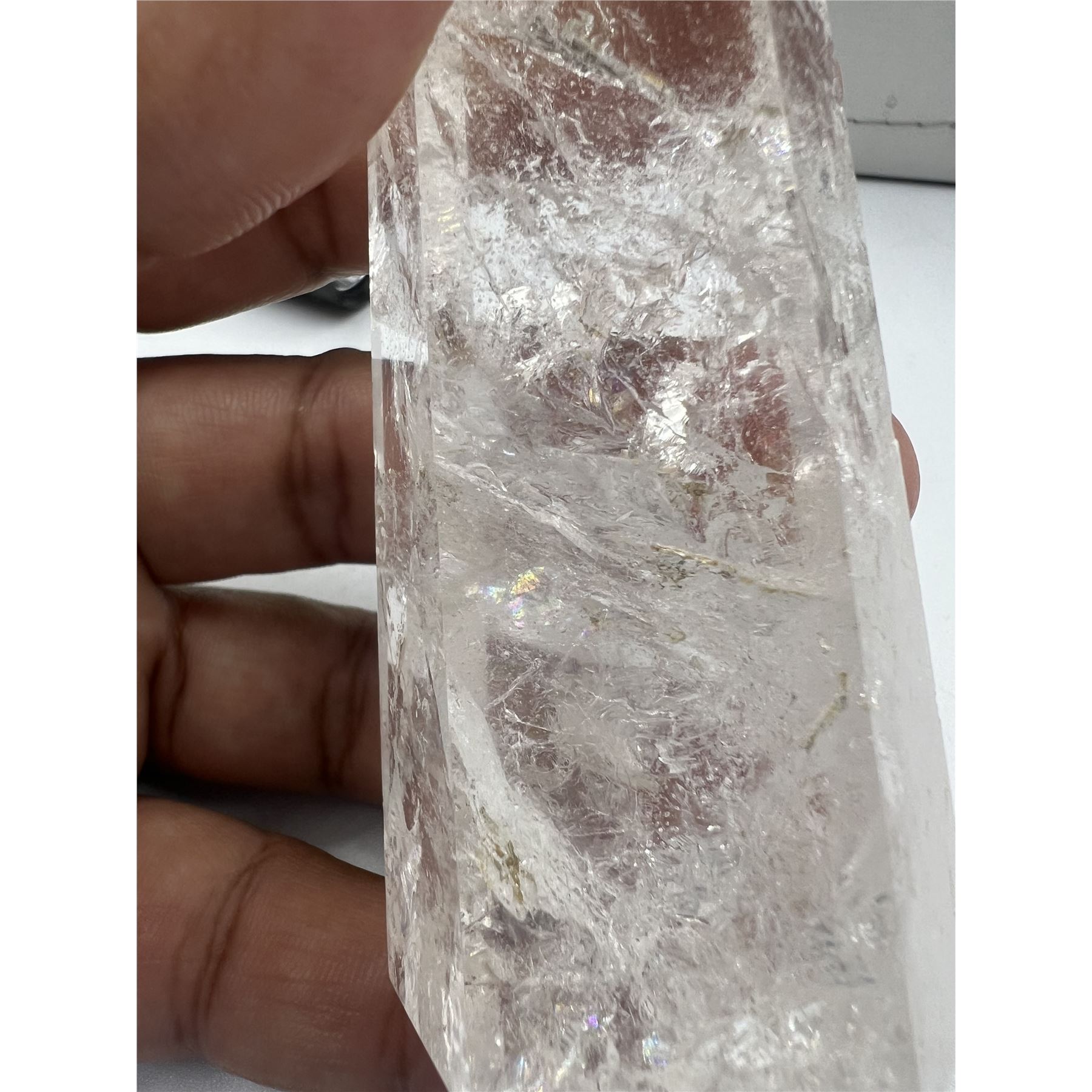 4 INCH CLEAR QUARTZ TOWER IN AURA INCULSION