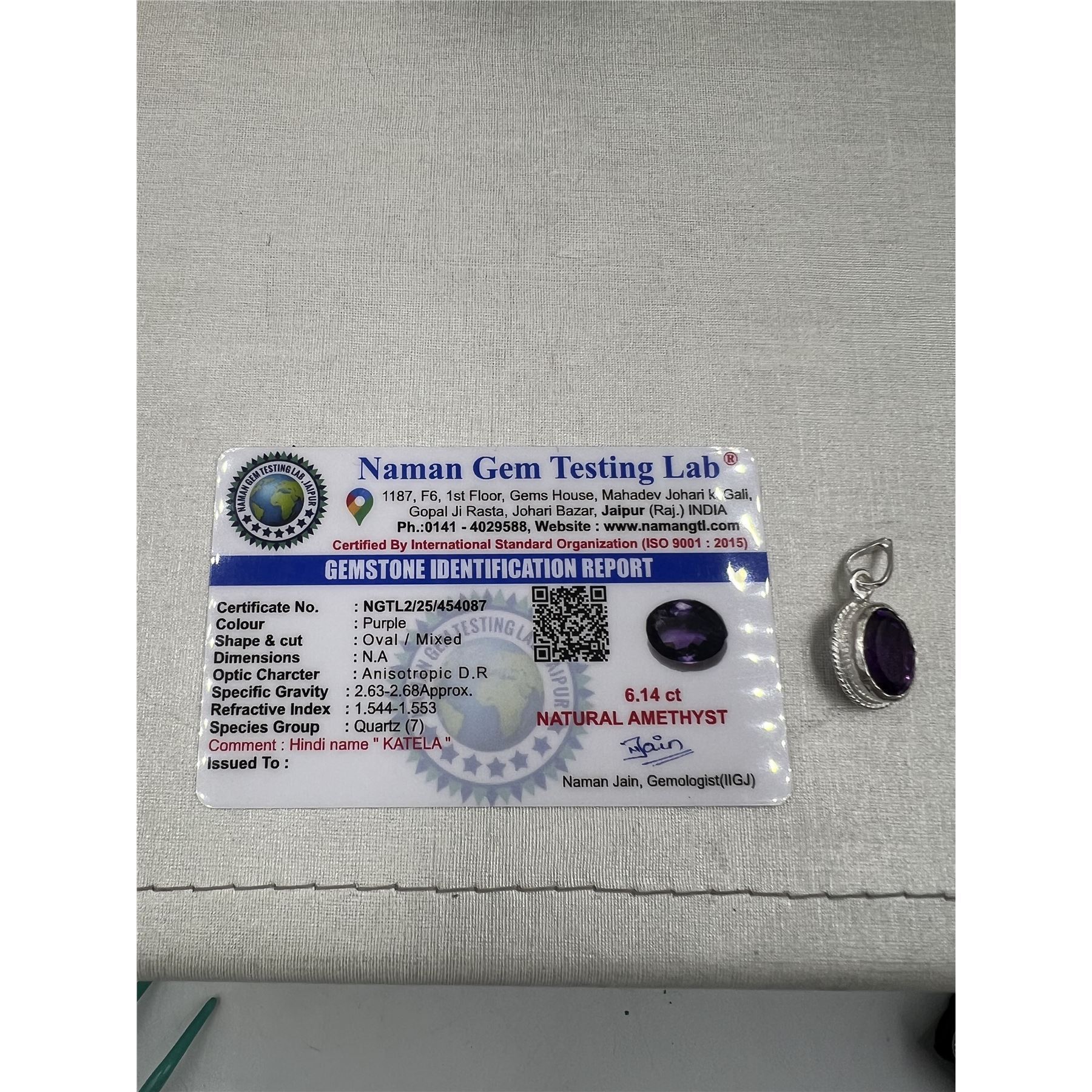 6.14 CT NATURAL AMETHYST SILVER PENDANT OVAL CUT CERTIFICATION