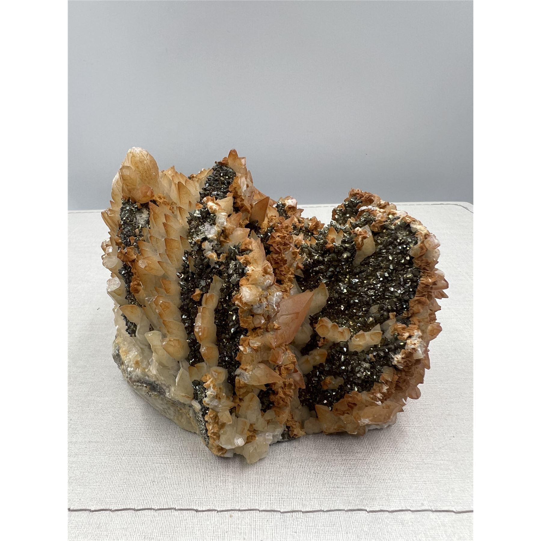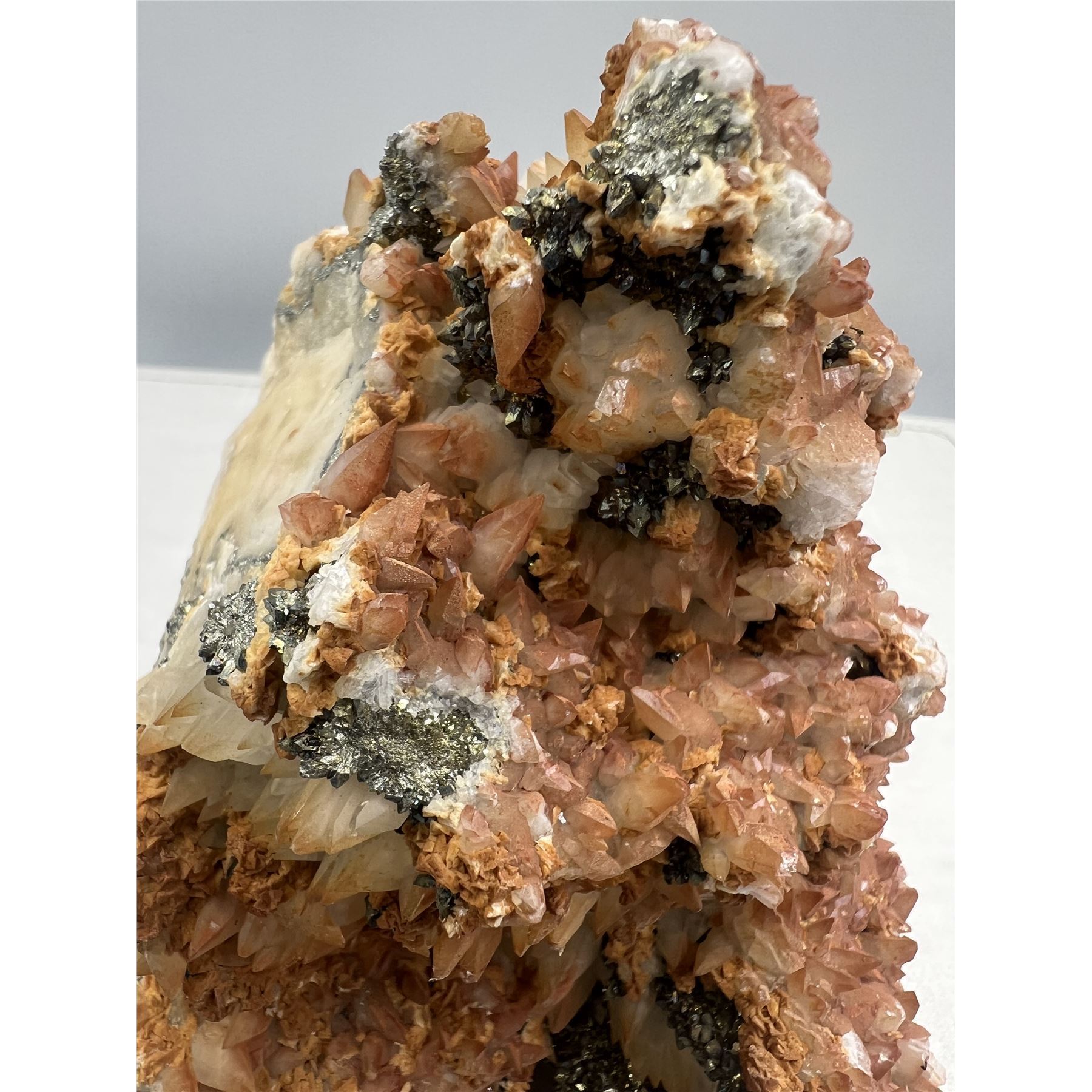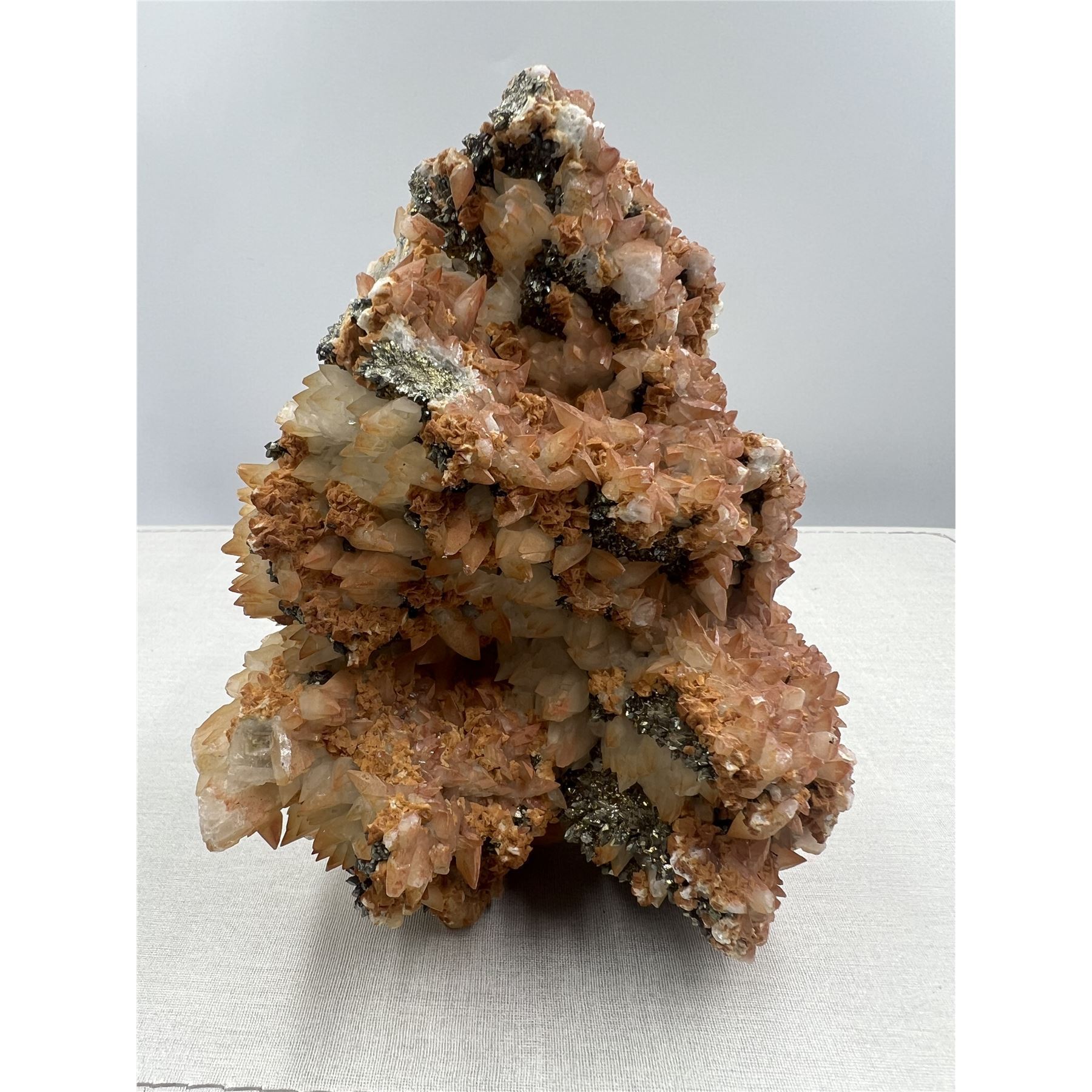 6 X 4.5 INCH DOG TOOTH RED CALCITE SPECIMEN WITH PYRITE