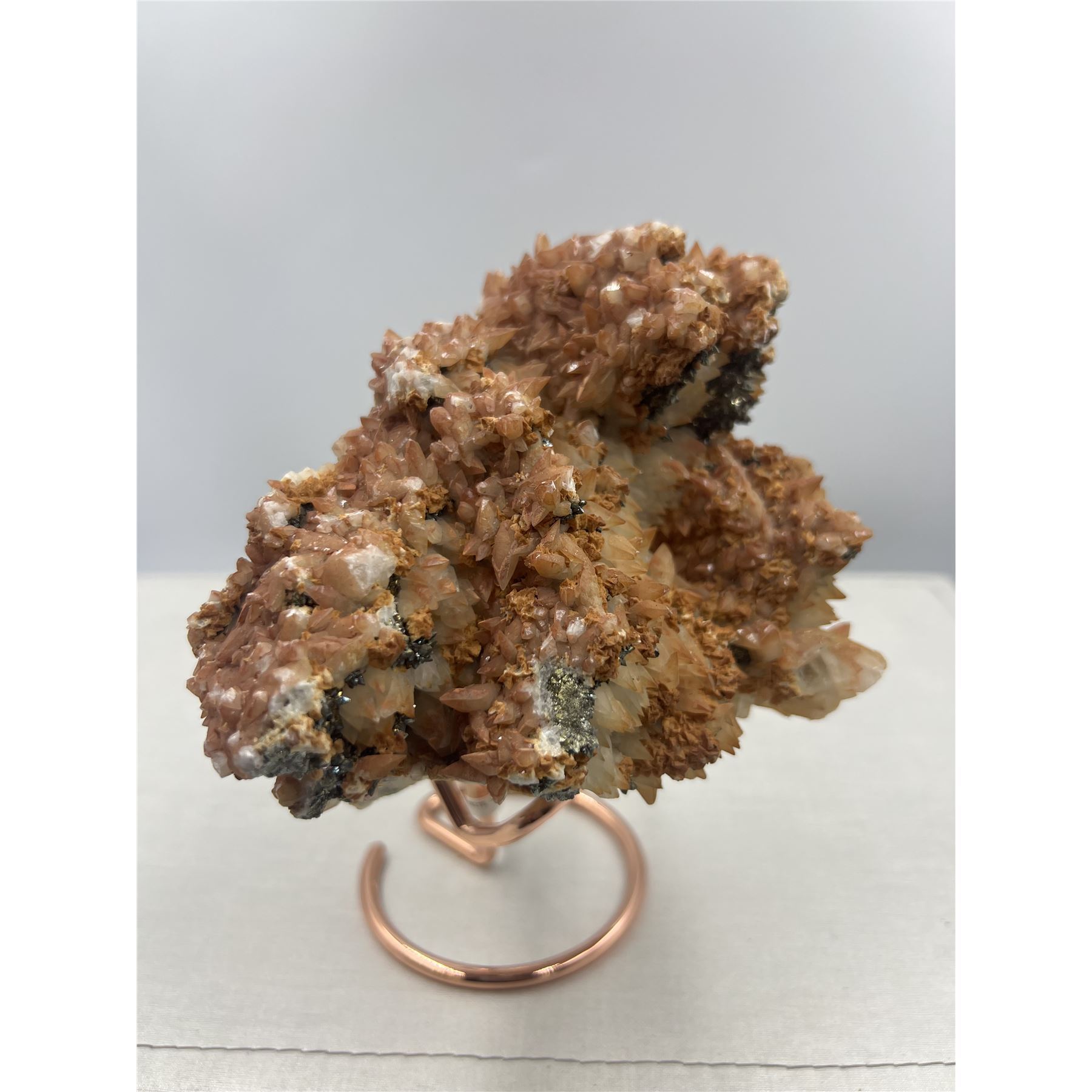 6 X 4.5 INCH DOG TOOTH RED CALCITE SPECIMEN WITH PYRITE ON STAND