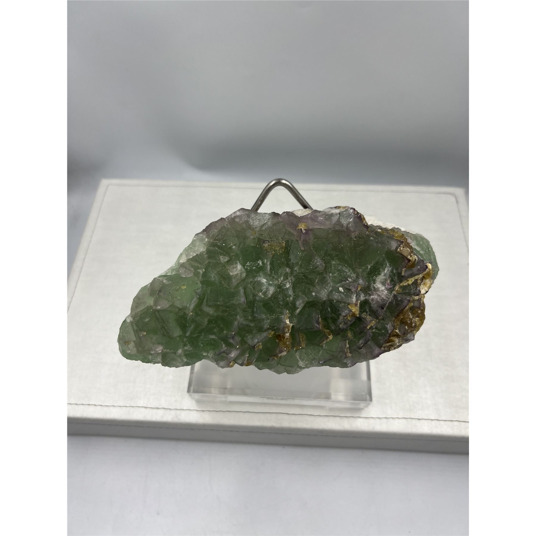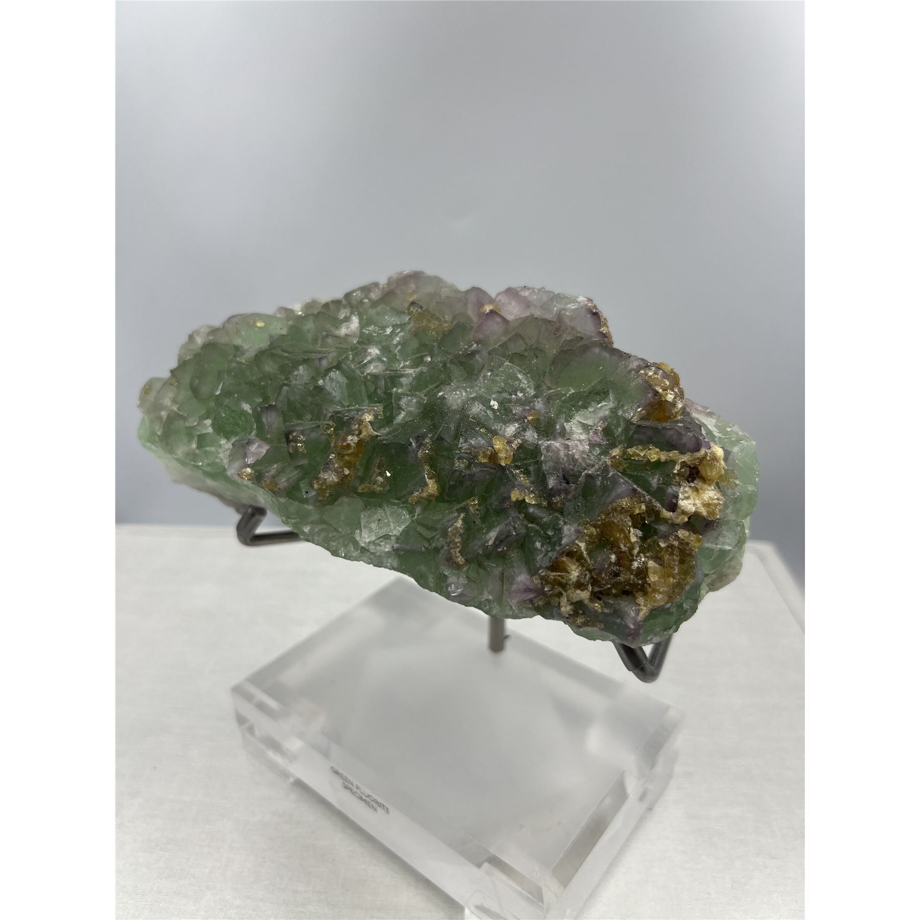 8 X 7 INCH RARE FORMATION PURPLE AND GREEN FLUORITE WITH BARITE ON STAND