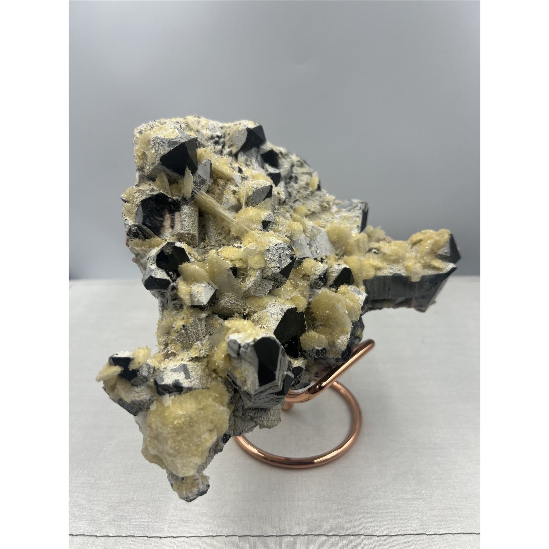 8 X 8 INCH BLACK CRYSTAL WITH YELLOW CALCITE QUARTZ SPECIMEN ON STAND